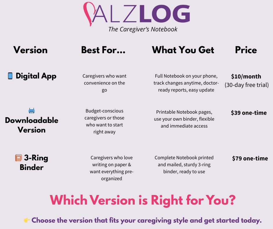 Every caregiver is different—that’s why Alzlog comes in three versions. Pick the one that best fits your caregiving style, whether you love digital convenience, quick downloads, or a ready-to-use binder.
